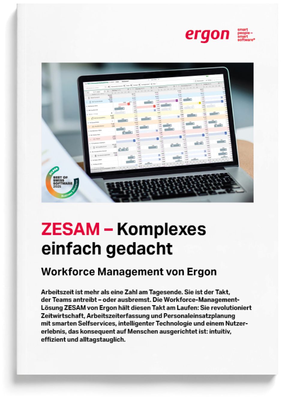 Arbeitszeit ist mehr als eine Zahl am Tagesende. Sie ist der Takt, der Teams antreibt – oder ausbremst. Die Workforce-Management-Lösung ZESAM von Ergon hält diesen Takt am Laufen: Sie revolutioniert Zeitwirtschaft, Arbeitszeiterfassung und Personaleinsatzplanung mit smarten Selfservices, intelligenter Technologie und einem Nutzererlebnis, das konsequent auf Menschen ausgerichtet ist: intuitiv, effizient und alltagstauglich.