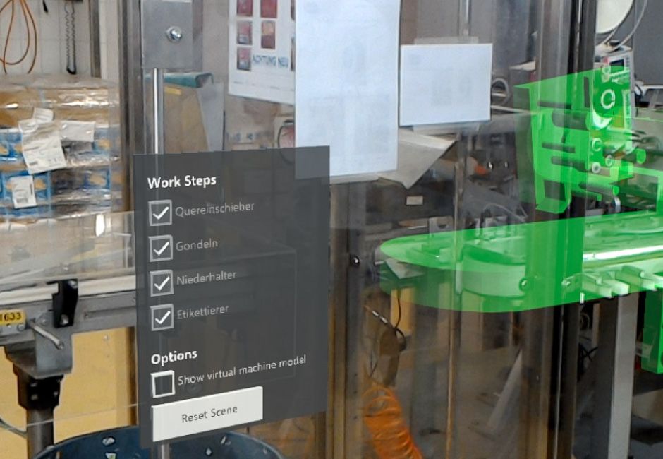 Wie funktioniert das? An der Maschine gilt es, gewisse Teile zu verändern, um neue Parameter einzustellen. Eine Fachkraft setzt sich die HoloLens auf und die zu bearbeitenden Teile erscheinen in der Brille rot eingefärbt. Dies bedeutet: An all diesen Teilen muss etwas verändert werden. Tippt die Fachkraft auf einen Bereich, schiebt sich in der Brille ein Anleitungsvideo ins Sichtfeld, das auf einem virtuellen Bildschirm neben dem Arbeitsort der Person erscheint und zeigt, was zu tun ist. Ist dies in der realen Welt genauso vollzogen, erscheint eine Checkliste und der Arbeitsschritt wird als erledigt markiert. Der erfolgreich veränderte Bereich erscheint nun grün eingefärbt. Jetzt werden Schritt für Schritt die restlichen roten Bereiche bearbeitet. Das Video zeigt wie, die Checkliste protokolliert.