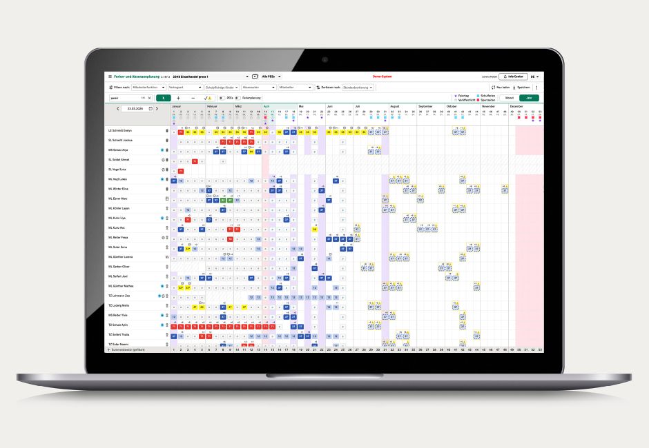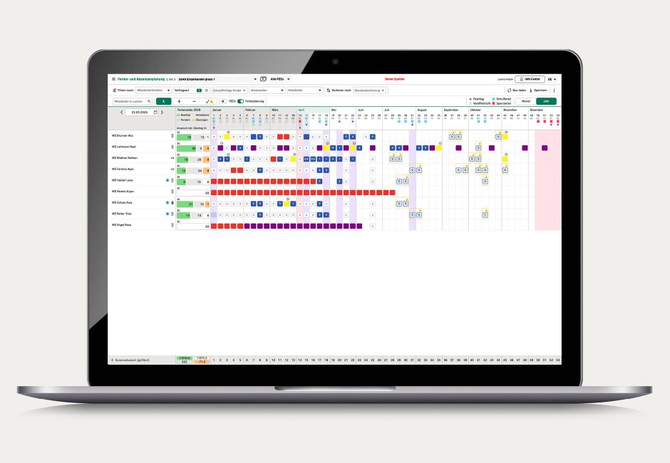 Die Monats- und Jahresansicht zeigt den einzelnen Antrag und die Planung im zeitlichen Zusammenhang. Sperrzeiten, Feiertage und weitere Ereignisse wie Schulferien sind auf den ersten Blick ersichtlich. In den Mitarbeitendeninformationen ist ersichtlich, wer schulpflichtige Kinder hat.